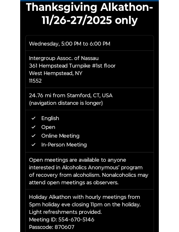 Holiday Alkathon with hourly meetings from 5pm (est) holiday eve to 11pm on the holiday
